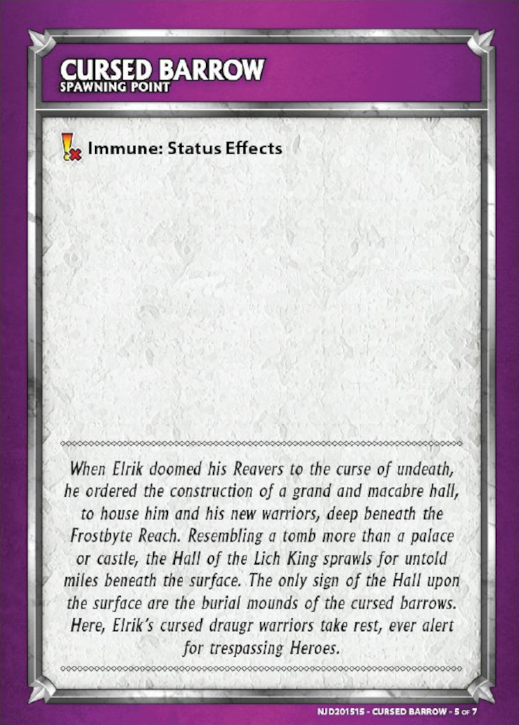 Flavor Text: When Elrik doomed his Reavers to the curse of undeath, he ordered the construction of a grand and macabre hall, to house him and his new warriors, deep beneath the Frostbyte Reach. Resembling a tomb more than a palace or castle, the Hall of the Lich King sprawls for untold miles beneath the surface. The only sign of the Hall upon the surface are the burial mounds of the cursed barrows. Here, Elrik's cursed draugr warriors take rest, ever alert for trespassing Heroes.